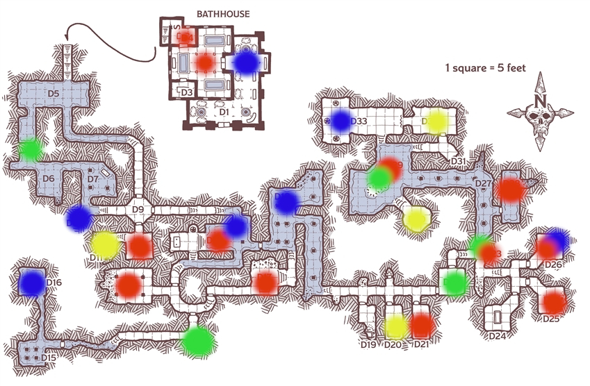 The Dungeon of the Dead Three in particular deserves a closer look, because of anything within Descent it is most like a classic dungeon crawl, and seems to want to evoke the feeling of one - even if it pays no attention to the exploration elements of timekeeping, supply or risk management. Yet, despite disfavoring an exploration playstyle (which is hard not to with the 5th Edition of Dungeons & Dragons mechanics) Dungeon of the Dead Three includes many aspects that superficially make it appear to be a classic dungeon: a looping map that includes empty or nonessential rooms, traps and secret doors as well as a traditional feeling of the dungeon crawl - the infiltration or exploration of close corridors in an alien underworld. Here of course that’s focused on a sewer, which unfortunately is also a popular video game cliche, but at least it avoids including wererats. Because of these inclusions, it’s easier to conceive of the The Dungeon of the Dead Three as a classic dungeon, and despite its designers clear intent for it to play very differently, one can interrogate it in the context of running a resources, risk v. reward dungeon crawl.